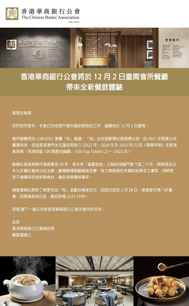 香港華商銀行公會 將於12月2日重新開放,提供更優質的餐飲體驗。